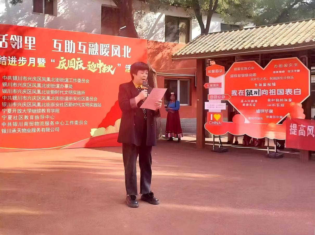 陈爱梅书记的致辞:各位朋友大家好!在这秋风送爽、丹桂飘香的美好时节,我们怀着无比喜悦的心情,相聚在康养广场,共同举办崇安社区民族团结进步月暨“庆国庆 迎中秋”为主题的文艺汇演活动。国庆,是我们伟大祖国的生日,代表着繁荣、昌盛与自豪。中秋,是中华民族的传统佳节,象征着团圆、和谐与美满;当中秋邂逅国庆,家国同辉,这份喜悦与自豪更是加倍。在这个特殊的日子里,我们相聚一堂,共同欣赏精彩的文艺节目,感受社区大家庭的温暖与欢乐,同时也为祖国母亲送上最真挚的祝福。