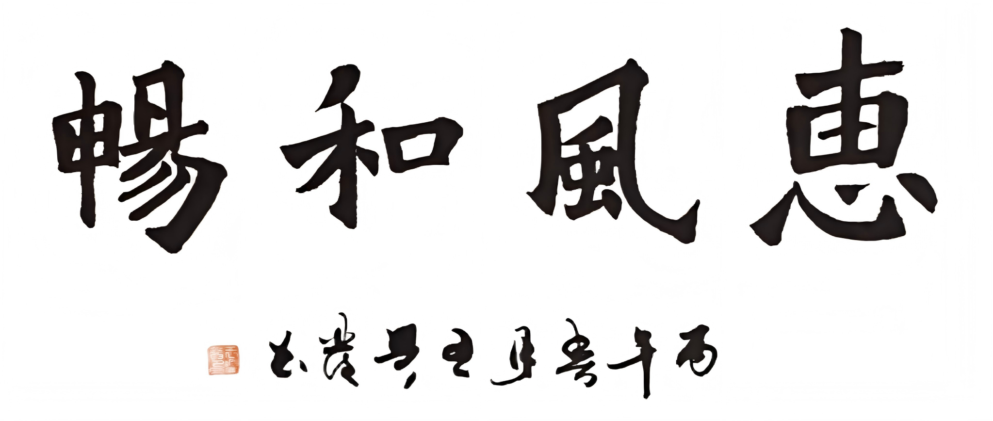 2. 笔法与线条笔法延续了魏碑方笔的雄健,但相较前作多了几分温润灵动。“惠” 字的撇捺开张有度,“風” 字的外框转折刚劲,内部笔画细腻灵动,“和”“暢” 二字线条粗细对比自然,墨色浓淡过渡和谐,既保持了骨力,又传递出 “惠风” 的柔和之气,刚柔并济的处理十分精妙。